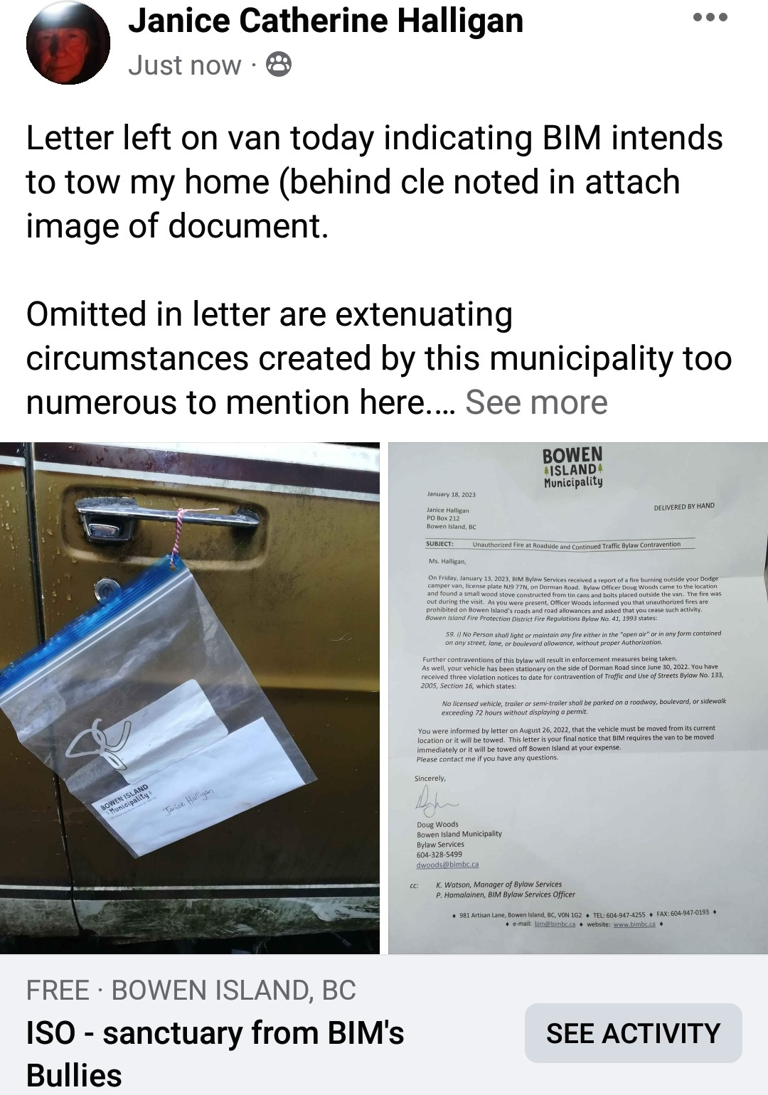 Posting here now because the circumstances have not changed and survival mandates safety be found. I seek refuge on private property on Bowen Island because there is no safety for me on public property on this island at this time.