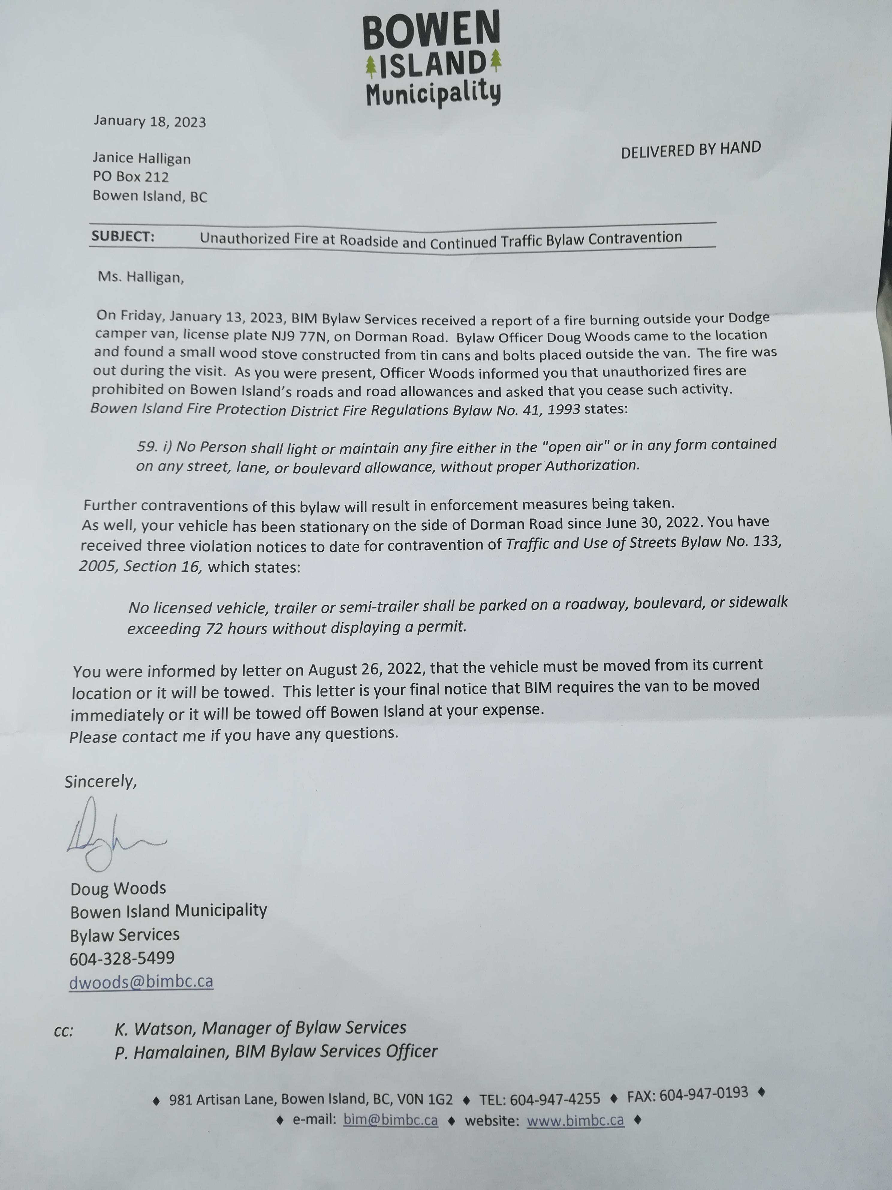Letter left on van today indicating BIM intends to tow my home (vehicle noted in attach image of document.
